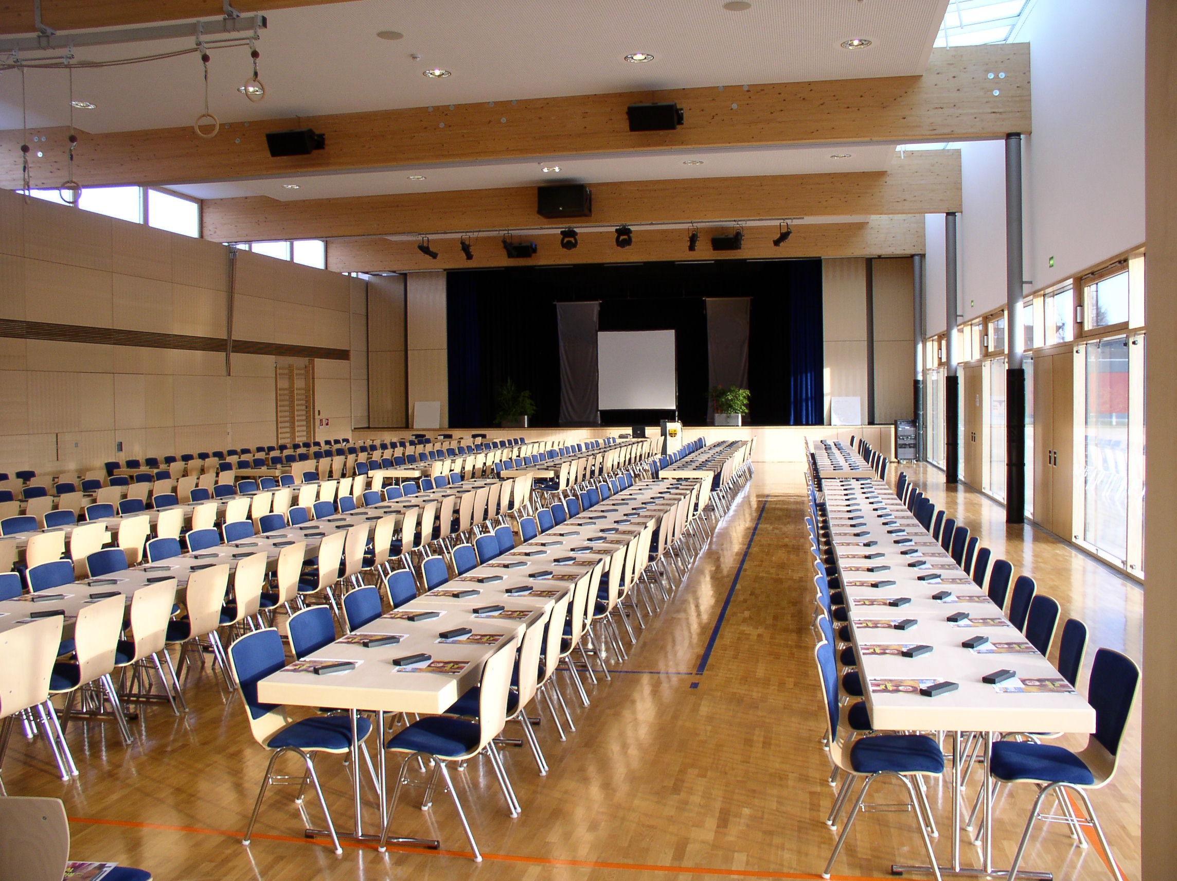 Die 90 qm große Bühne mit zusätzlichem Bühnenvorraum und Bühnenlager ist mit modernster Licht- und Beschallungstechnik ausgestattet. Vom gegenüberliegenden Regieraum aus kann die Bühnentechnik funktional gesteuert werden. Die Bühne ist mit einer mobilen Wand von der Kulturhalle abtrennbar. Großzügig bemessene Fensterelemente auf der Bühnenrückseite gewährleisten eine direkte Bühnenanlieferung. Bei Freilichtveranstaltungen im Sommer ist sie auch nach außen hin nutzbar.