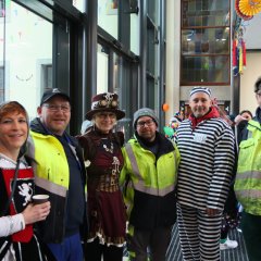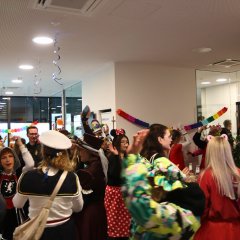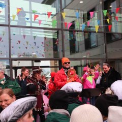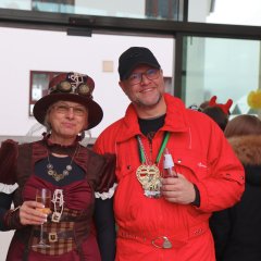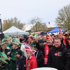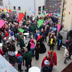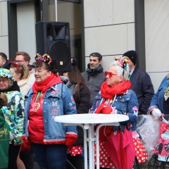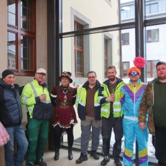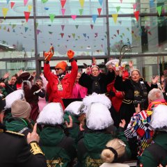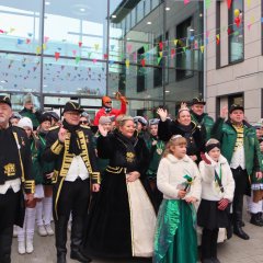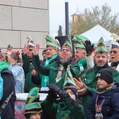 Zur Unterstützung der Neuhofer Karnevalisten waren auch Närrinnen und Narren aus den Randstaaten angereist. Aus Hattenhof waren Prinz Dominik XVI. und Prinzessin Lara XIX. mit dabei, aus Rommerz Prinzessin Tatjana LXX. und aus Niederkalbach Prinz Markus LXXIV. Aus Neuhof sorgten außerdem Toni und Kilian Lumpazi der LXVI sowie die Lumpengarde für noch mehr Fastnachtsstimmung. Gegen diese närrische Übermacht mussten sich Bürgermeister Heiko Stolz und sein Team geschlagen geben und den Rathausschlüssel nach einem gemeinsamen Flashmob an die Tollitäten übergeben.