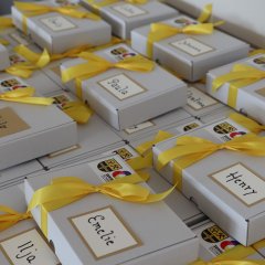Als kleines Willkommensgeschenk gab es für jede Familie ein personalisiertes Besteckset, ein Halstuch und handgestrickte Söckchen, die mit viel Herz vom Ökumenischen Strickkreis Neuhof angefertigt wurden.